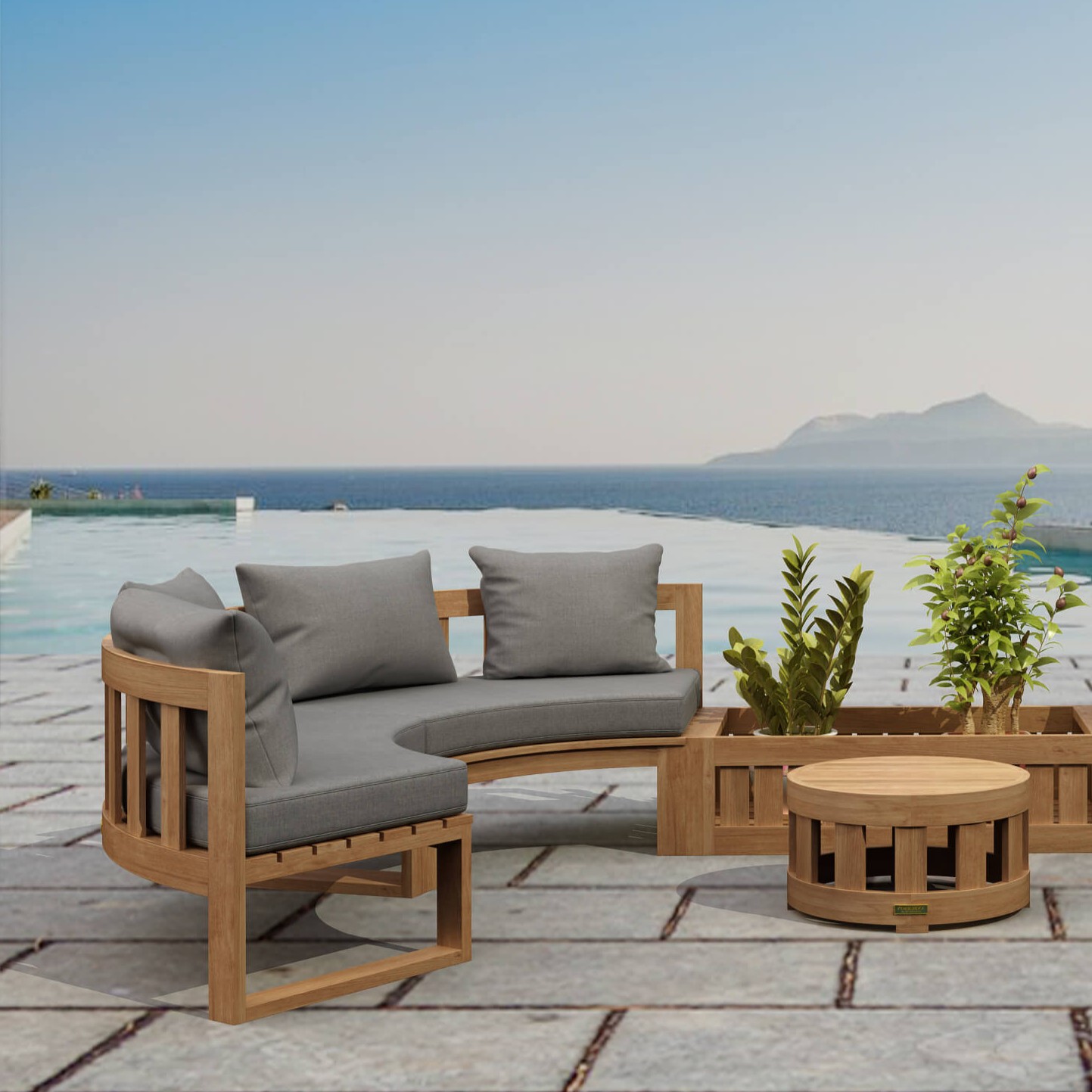 Includes 5″ thick cushions and pillows in your choice of Sunbrella® fabric.
